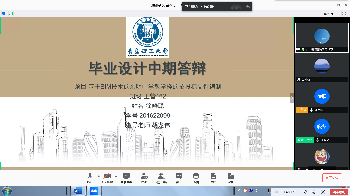 管理工程学院副院长申建红教授等十名指导老师和工程管理专业139名毕业生在线参加了这场特殊时期的本科毕业设计(论文)中期答辩,从上午8:30到下午17:00,整个线上中期答辩在专业与严肃的氛围中顺利完成。