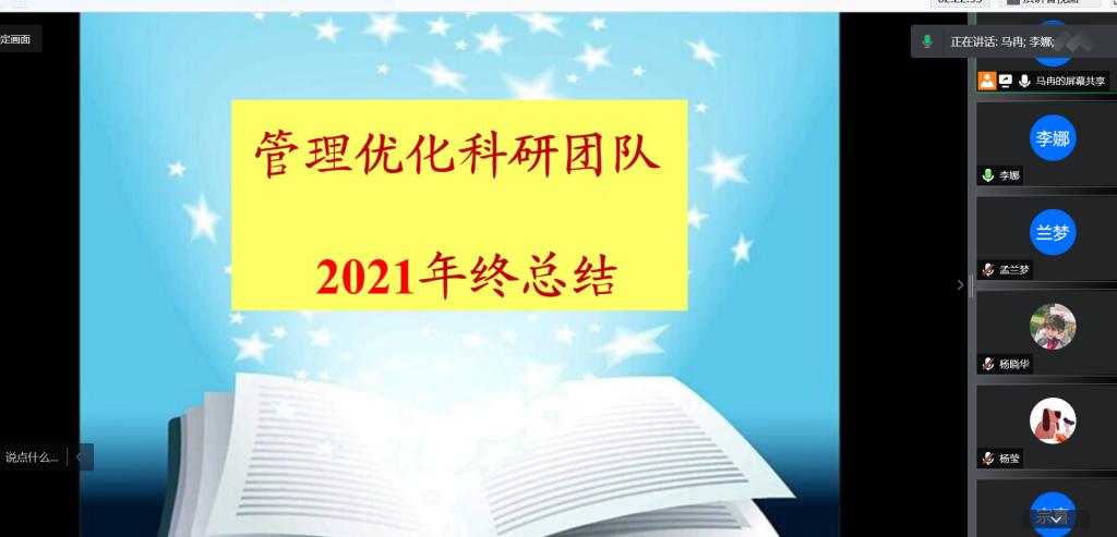 2022年1月6日下午14:30-17:30,管理工程学院管理优化科研团队在线上召开2021年年终总结会议。马冉老师、张振森老师、王静静老师、孙学芳老师、武华华老师、徐然老师以及各位老师所指导的研究生共20余人参加会议。会议由马冉老师主持。