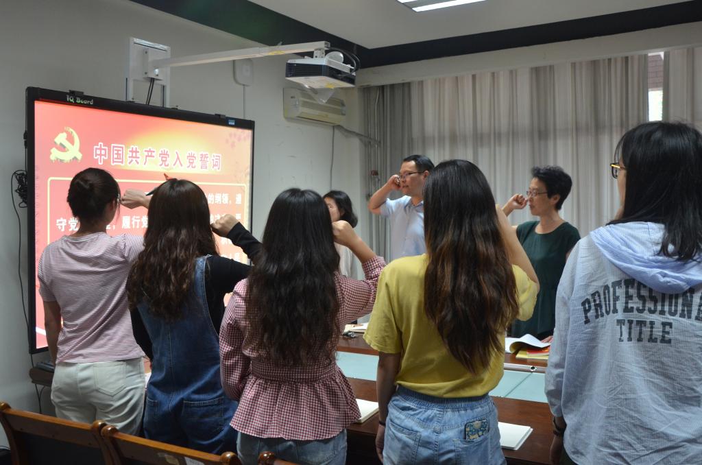 仪式在庄严的《国际歌》中拉开序幕。梁虹为预备党员代表戴纤佩戴党徽并赠送学习图书《习近平关于“不忘初心、牢记使命”论述摘编》,党员代表石敏带领全体预备党员面向党旗庄严宣誓。宣誓结束后,研究生党员代表吕云翔和本科生党员代表石敏进行表态发言,表达了学院学生党员不忘初心、砥砺前行的决心,并表示将以习近平新时代中国特色社会主义思想武装头脑,统一思想、振奋精神,在工作、学习、生活中发挥好模范带头作用。