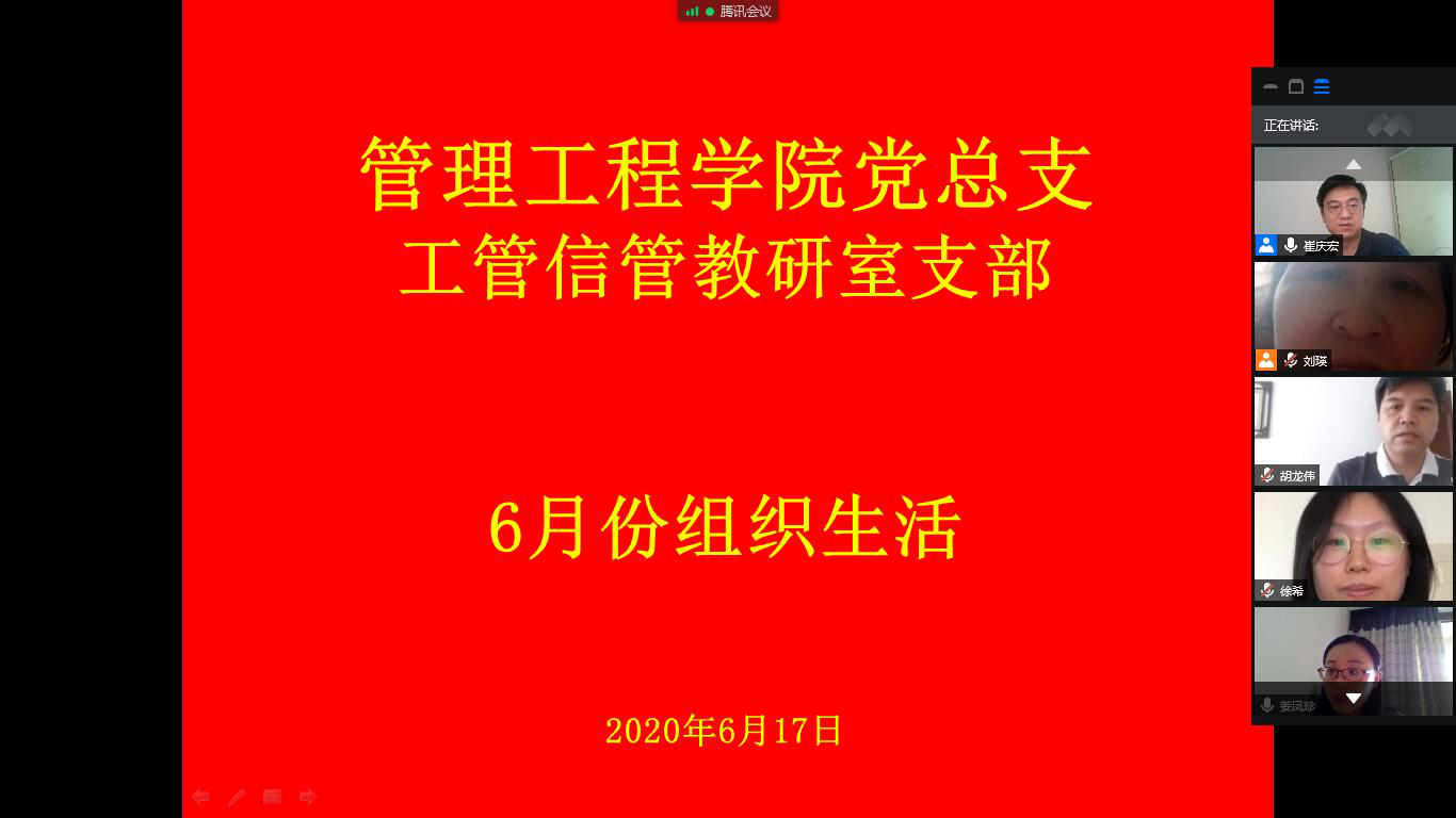 2020年6月17日下午,管理工程学院工管信管教研室党支部通过腾讯会议召开线上会议,开展6月份组织生活,活动内容主要包括理论学习与微党课主题党日活动。