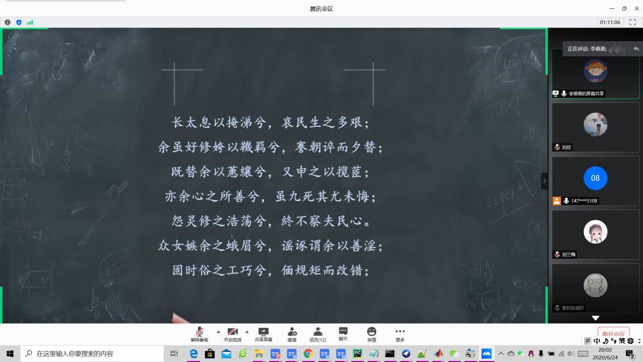 在“颂端午”和“悟端午”环节中,同学们情绪高昂,交流热烈。组织委员李蓓蓓领诵《离骚》(节选),刘欣、朱琛、张丽敏、刘淑芳作为小组代表,分享了各自家乡的端午习俗及对端午文化精神的认知和理解,并选取了苏轼《浣溪沙·端午》、《端午六幺令·天中节》,文天祥《端午即事》,赵藩《端午三首》,张耒《和端午》等诗词以及一些谚语与大家进行分享,重温中华优秀传统文化,感悟忠于祖国、忠于人民的精神信仰。张丽敏表示:“作为一名新时代大学生,一方面要做卫护生命健康,敬畏自然的表率,养成健康、积极的生活方式,特别是现在还处于疫情防控阶段,我们更要从自身做起,这既是对自己的生命健康的珍重爱护,也是为他人的生命健康负责;另一方面,作为半年之后就要踏入社会的新时代青年,更应当珍惜在校时光,不断提高自己的能力,在未来能够到祖国最需要的地方服务人民,以自己微薄之力为中华民族伟大复兴奉献自己的一份力量。”