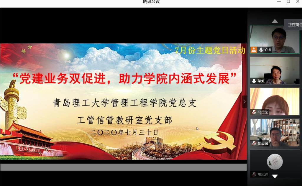 7月30日,管理工程学院工管信管教师支部以“党建业务双促进,助力学院内涵式发展”为主题开展党日活动。党总支书记梁虹与支部全体党员通过线上会议方式参会。本次活动由支部书记崔庆宏主持。