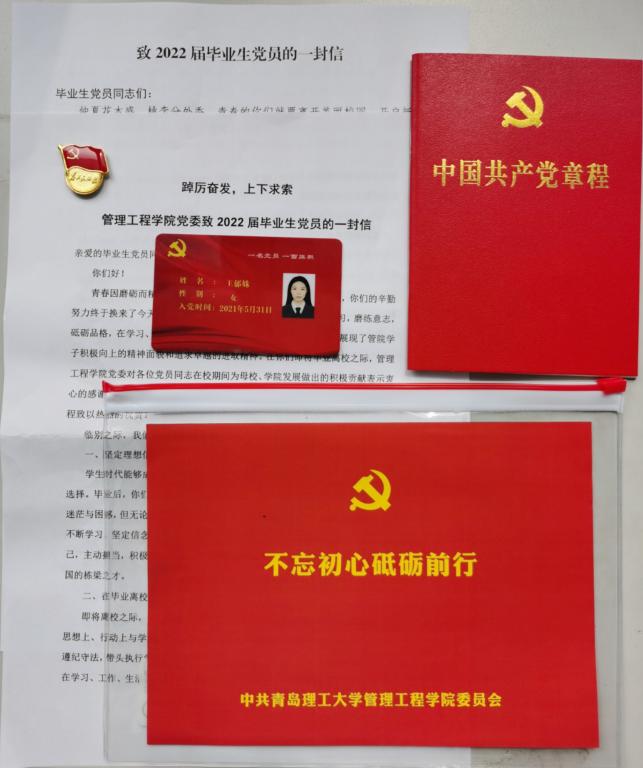 李洪民为每一位毕业生党员赠送了代表学院党委祝福的“红色锦囊”,锦囊里装有学校党委组织部《致2022届毕业生党员的一封信》、《管理工程学院党委致2022届毕业生党员的一封信》,党章、定制毕业生党员身份证和一枚党徽,希望广大毕业生党员在新的人生征程中能够不忘初心,砥砺前行,做理想信念坚定的马克思主义者、做追梦圆梦路上的奋斗者。