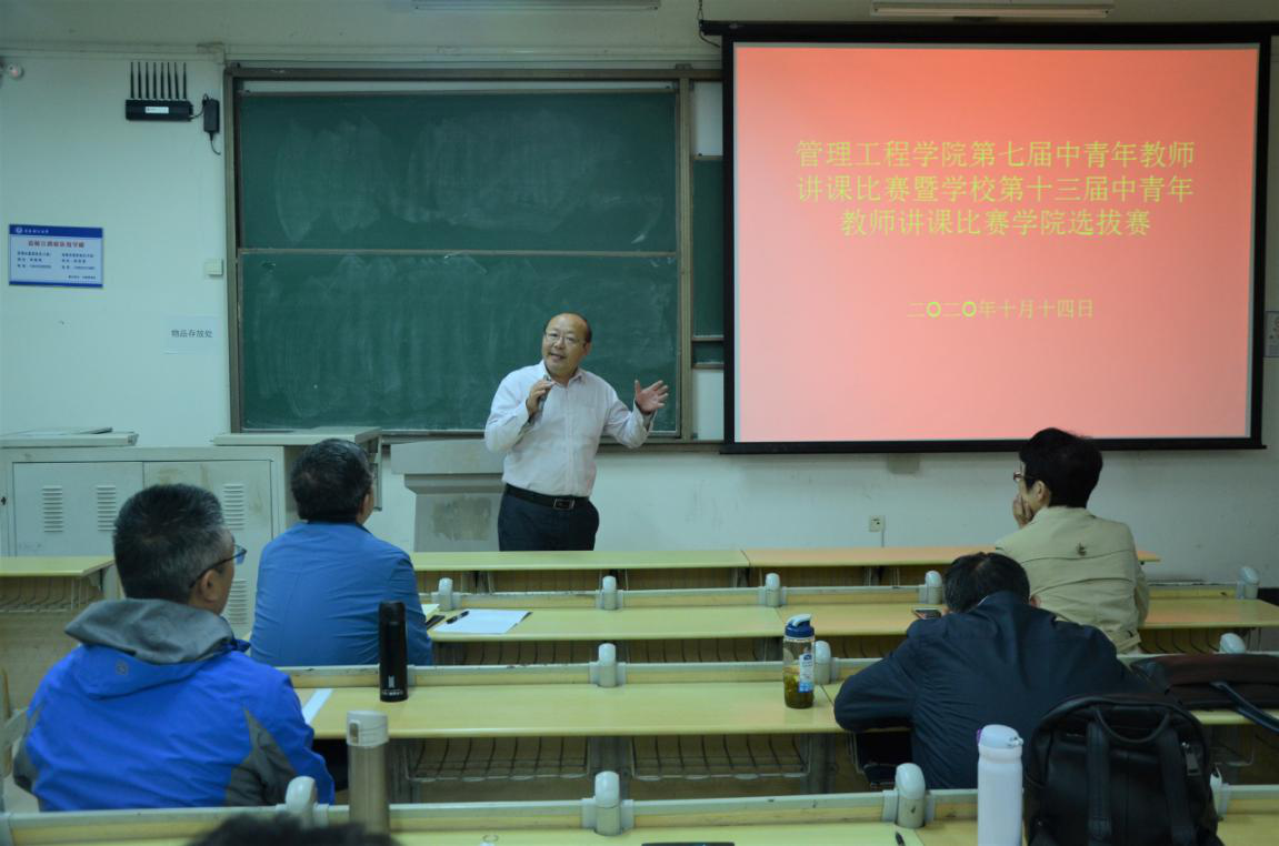 为加强师德师风建设,进一步提高中青年教师教学能力,10月14日,管理工程学院在新校区主教学楼B307教室举行了中青年教师讲课大赛学院选拔赛。这次比赛由学院领导、学院教学指导委员会成员代表担任评委,来自7个专业的15名老师参加了讲课比赛,部分教师到场观摩。比赛由教学副院长申建红教授主持。