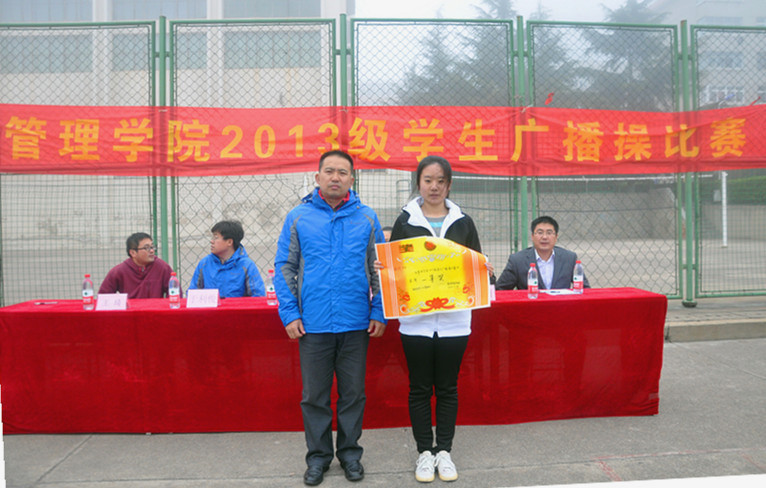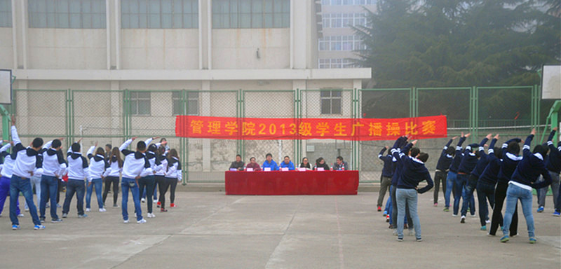 为落实团中央关于大学生 “走下网络、走出宿舍、走向操场”的“三走”通知,加强大学生的体育锻炼。管理学院于3月28日下午,在长江中路校区举行2013级新生广播操比赛。管理学院党总支书记申维东副书记、团总支书记于利俊老师以及各年级辅导员老师出席本次比赛并担任评委。