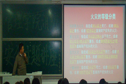 5月24日下午,管理学院在2教405教室举办以“教育为先,防范为主”为主题的消防安全讲座。管理学院党总支副书记申维东、校保卫处综合科科长石永岩、各年级辅导员以及各班班长、治保组长参加讲座。