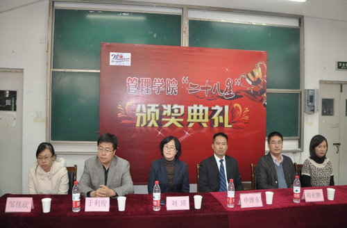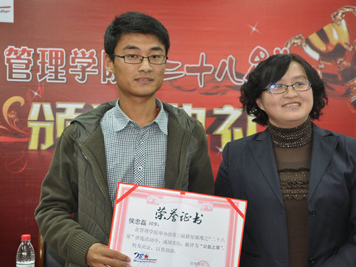 在响应党的十八大贯彻学习科学发展观之际,管理学院于11月8日下午在二教阶401教室举行管理学院“二十八星”评选启动仪式。管理学院党总支书记刘瑛、党总支副书记申维东、团总支书记于利俊以及各年级辅导员老师参加会议。会上,申维东副书记致开幕词,刘瑛书记为管理学院“二十八星”之“公益之星”的侯忠磊同学颁奖,最后侯忠磊同学为同学做支教报告。 申维东副书记在致词中首先对侯忠磊同学在“好友营支教”中作出的贡献给予了充分的肯定和高度的赞扬;接着,他对新一届管理学院“二十八星”评选活动进行了阐述,与此同时也对广大师生提出要求:第一,群星闪耀,管理生辉;在“二十八星”的评选中,全面体现了“不拘一格降人才”的古训,真切落实了胡锦涛总书记>的会议精神和团中央、教育部、全国学联《关于实施“大学生素质拓展计划”的意见》精神,全面突出素质教育的个性化、人性化,从多角度、多层次、全方位培养学生的综合素质。第二,星光灿烂,事迹永恒;他希望同学能再接再厉,继续以高标准严要求规范自己,完善自我,为大家树立标杆,带领大家向更高的目标前进;同时更希望管理学院全体同学能够从小事做起,从生活点滴做起,积百步以成千里,从心开始,见贤思齐,共同寻找身边闪烁的璀璨之“星”,共同感受平凡中蕴含的力量,向先进看齐,向先进学习,明确目标,不断提升个人综合素质,体现自我价值,争做优秀。第三,星星之火,可以燎原;新一届群星璀璨之“管院二十八星”评选活动将继续秉承“树典型,表先进,求和谐”的宗旨,将会从身边最普通、最平凡的同学中,寻找那些以自己的坚持、勤勉、创新、奉献,从点滴小事做起、在平凡中汇聚力量的“管院二十八星”。 本届“二十八星”之“公益之星”的侯忠磊同学在获奖感言中与在座同学分享了暑假支教生活的酸甜苦辣,同时,他也呼吁能够有更多同学加入到假期支教队伍中来,尽展新一代大学生风采;现场同学在听讲山区孩童日常生活及受教育情况后无不动容,他“公益之星”的大爱无私的精神深深感染了广大同学,影响了身边同学怀有一颗奉献之心为社会、为大家贡献自己的力量。 管理学院“二十八星”作为学院学生教育六大平台之一,是树立先进典型、发挥朋辈激励作用的平台,是学院的品牌活动,一直以“树典型,表先进,求和谐”为宗旨,活动的主角都是大家身边普通、平凡的同学,他们凭借自己的坚持、勤勉、创新、奉献等各种优秀品质脱颖而出,成为同学中的佼佼者,创先争优的典型人物。“二十八星”通过严格的评审,优中选优,树立典型,引领广大同学形成良好的学习品质和道德风尚,使爱国、守法、诚信、友爱、奉献、创新成为我院大学生的主流价值观,更将进一步推动我院思想政治教育、学风建设等工作向更高层次迈进。 管理学院一直注重学生的“德智体”全面发展,“二十八星”评选活动至今已开展三届,旨在突出素质教育,多角度、多层次、全方位培养学生的综合素质。此次启动仪式的举行,充分发挥了优秀学生的模范榜样作用,调动了广大同学的积极性,激励同学们争先创优 ,形成良好的学习品质和道德风尚。同时,此项活动的开展,也为学院同学搭建了一个展现自我、启迪思想、升华人格的良好平台,进一步推动了学院学风建设、思想道德教育等工作的开展。(管理学院 高含)