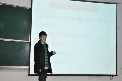 为加强学风建设,帮助考研同学树立良好心态,11月21日下午,管理学院举办了考研经验交流会。管理学院09级辅导员刘亚鹏老师出席了此次经验交流会,学院邀请了08级优秀毕业生,成功考取中国石油大学研究生的韩明一为现场同学解答考研相关事宜。