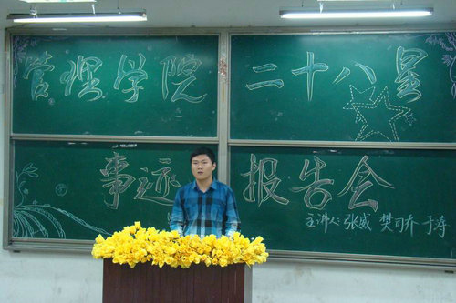5月15日晚,管理学院在二教阶401举行了“管理学院二十八星优秀事迹报告会”。本次报告会由管院二十八星之“院会之星”——曾任管理学院学生会主席、成功保研的张威同学,“创新之星”——曾获全国数学建模大赛国家一等奖、山东省十大优秀学生提名奖、保研至哈尔滨工业大学的樊司乔同学,“考研之星”——考取同济大学研究生、在校期间获得双学位的于涛同学为低年级学生做了精彩的报告。