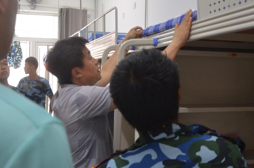 内务整理是新生军训的重要组成部分,在于利俊的带领下,各位辅导员分别带队,深入每一间新生宿舍,全面检查被褥叠放、桌面清洁、地面洁净、消杀通风及洗漱用品的摆放等情况。检查过程中,学院领导严格按照军训内务整理标准对新生宿舍的内务整理情况进行整体评价,对存在的问题进行一一进行指导,将标准和整理方法传授给学生,同时与新生们进行亲切交流,解答新生疑问,增进师生感情。于利俊讲到,军训是新生大学生活的第一堂课,而内务整理是这堂课的重要内容,同学们要严格落实军训要求,宿舍内的物品摆放要整齐划一,被褥方正统一,地面干净整洁,垃圾及时丢弃,展现出窗明几净的良好风貌。他还特别强调了军被和枕头的摆放位置,并亲自动手指导学生如何使被子棱角分明,平整规范。他提醒同学们每天进行消杀防控、开窗通风,严格落实防控要求,同时要注重自身安全,上下爬梯、清理窗户玻璃等活动的过程中一定要注意安全。新生们对学院领导的关怀表示由衷感谢,纷纷表示绝不辜负老师们的殷切希望,将以更积极的态度投入军训。