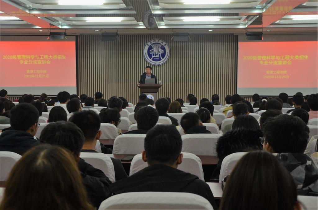 首先,申建红分析了目前高校实施大类招生的意义及形势,并就学院概况、专业设置情况、实验室和实践基地建设、教学成果与获奖、专业分流与转专业政策五个方面进行了全面的介绍,并重点就专业分流政策,从分流原则、分流组织、分流计划、分流机制、分流工作流程五个方面详细解读了《管理工程学院2020级管理科学与工程大类招生学生专业分流实施细则》的政策及要求,并对学校转专业政策进行了详细说明。申建红希望2020级管理科学与工程类的同学们能够结合自己的兴趣及未来职业规划做出适合自己的专业选择并为之努力奋斗,同时他希望同学们要不忘初心,志存高远,珍惜大学时光,努力拼搏,切实提高自身专业能力与素养。