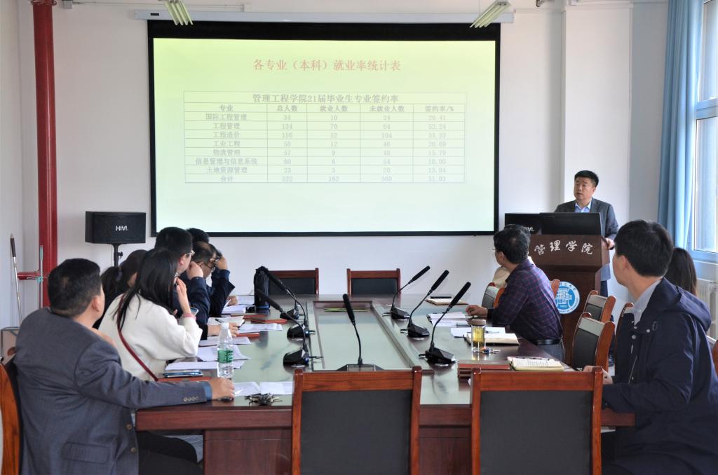 首先,于利俊通过PPT汇报了学院往年各专业就业工作的完成情况、今年目标任务、下一步工作安排,他着重分析了各专业目前就业状况、存在的问题及解决办法。