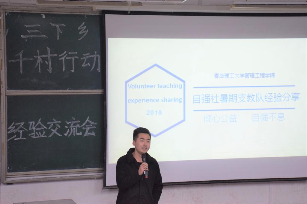 最后,由自强社支教队代表张杰进行经验分享与成果展示。他通过回顾整个支教过程,从与往年队员交流、获取经验,到精心录制讲课视频都体现出他们“倾心公益,自强不息”的精神。