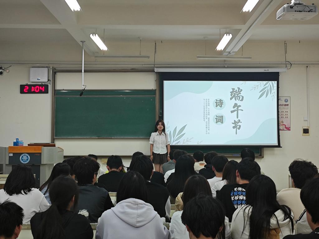 在“诗意端午,文化传承”主题诗词分享会上,学院团委书记宋晓峰结合课件向大家介绍了端午节的由来,为大家介绍了关于端午的史料记载、风物习俗、人物故事,并分析了端午节所蕴含的中国文化精神。大学生语言艺术协会成员为大家诵读赏析了《七律·端午》、《端午日赐衣》、《五丝》、《五月五日》等关于端午的诗歌,朗诵者饱含深情的唱诵,让现场观众沉浸在无限的诗心诗情当中,使大家领略了中华文化的深厚底蕴,进一步增强了大家对民族文化、民族精神、民族情感的认同。