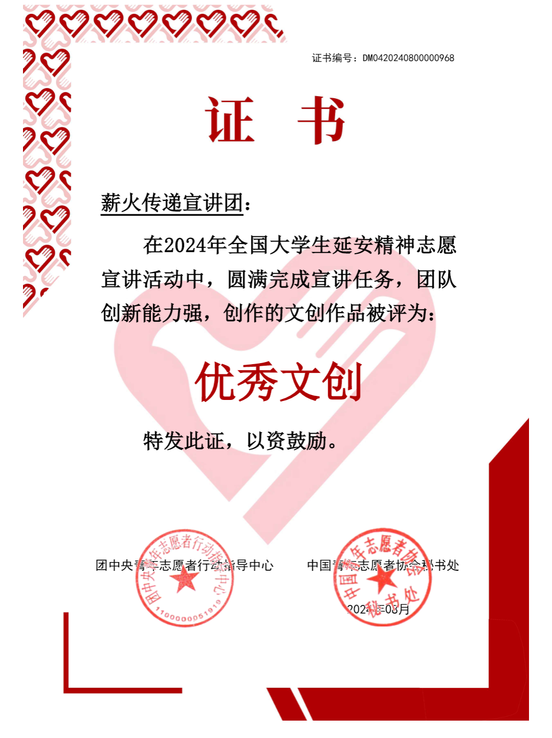 近日,团中央青年志愿者指导行动中心、中国青年志愿者协会秘书处联合公布了2024年全国大学生延安精神志愿宣讲活动“优秀文创”名单,管理工程学院 “薪火传递宣讲团”社会实践团队凭借出色的表现,脱颖而出,获评团中央全国大学生志愿服务活动“优秀文创”荣誉称号。