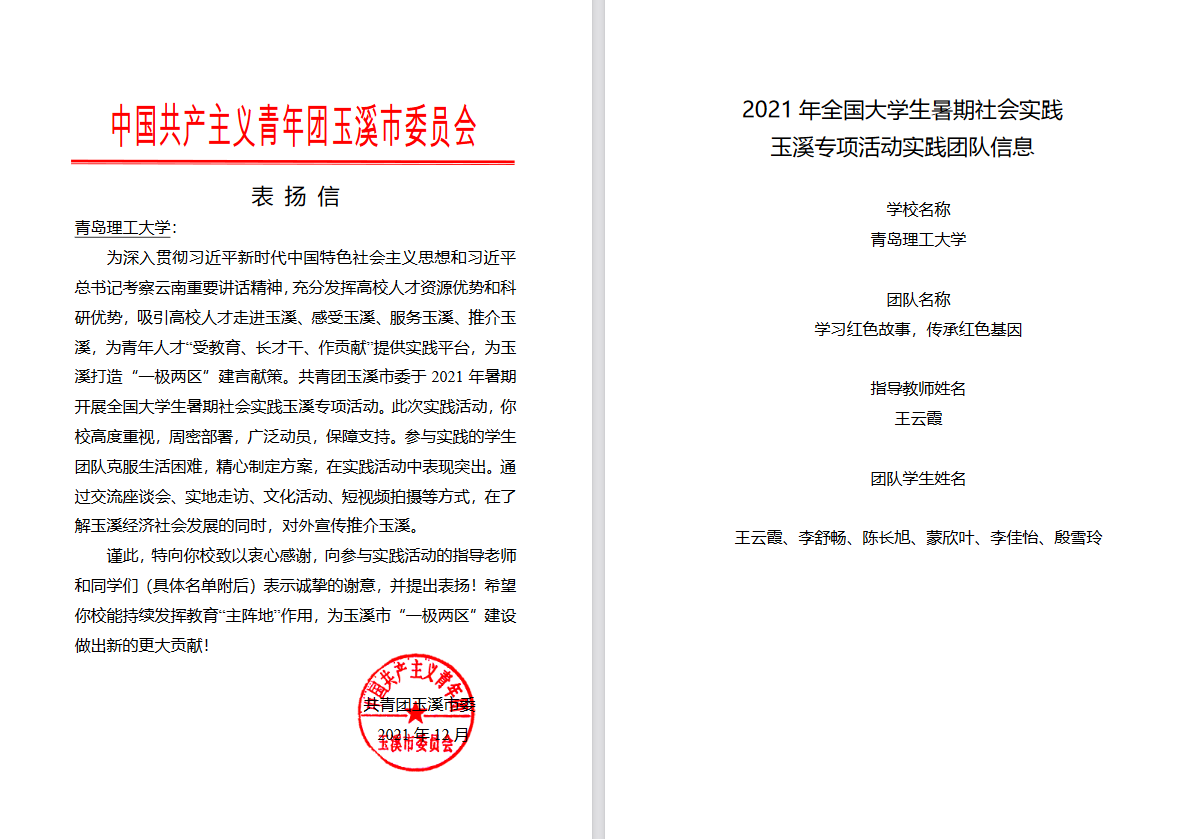 近日,管理工程学院收到了来自共青团玉溪市委的两封表扬信。对在2021年全国大学生暑期社会实践玉溪国家级专项实践活动中学院赴玉溪市两支暑期实践团队——学习红色故事,传承红色基因团队(指导教师:王云霞,队员:李舒畅、陈长旭、蒙欣叶、李佳怡、殷雪玲)和yl7703永利集团暑期社会实践团队(指导教师:张翔;队员:王淑腾、陈严、余克兴、张克璐)进行表扬和感谢,信中高度评价两支暑期社会实践团队在了解玉溪经济社会发展的同时,积极对外宣传推介玉溪,为“一极两区”建设所做出的贡献。
