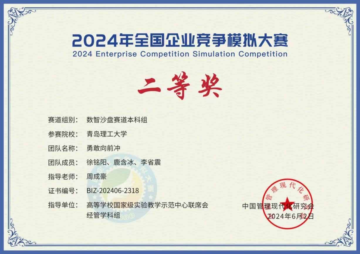 近日,由中国管理现代化研究会、高等学校国家级实验教学示范中心联席会经管学科组指导,中国管理现代化研究会决策模拟专业委员会主办的2024全国企业竞争模拟大赛——人力资源决策及数智沙盘赛道通过线上竞赛落下帷幕。我校获得人力资源决策赛道国家一等奖1项,国家三等奖3项;数智沙盘赛道国家一等奖1项,国家二等奖2项,王中帅、陈贞老师获得优秀指导教师。