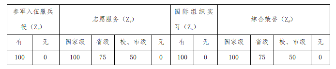 指标包含:科研论文(Z1);科研竞赛(Z2);学生参军入伍服兵役(Z3);参加志愿服务(Z4);到国际组织实习等社会服务(Z5);综合荣誉等其他(Z6)6大类。综合能力成绩=∑(Zi成绩*Zi权重)