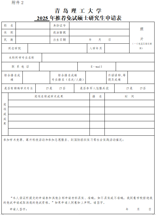 2025年推荐免试硕士研究生申请表