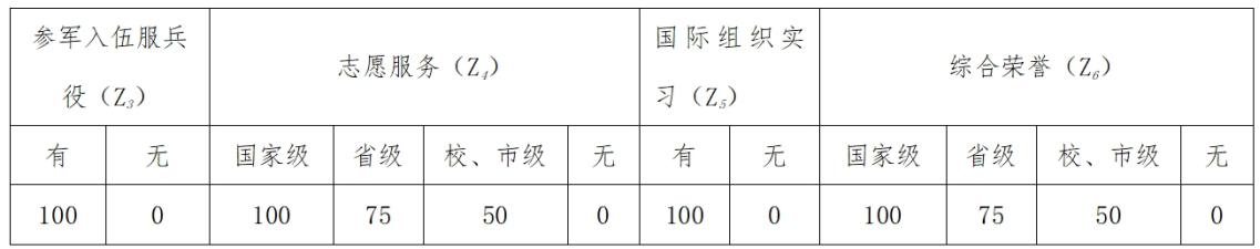指标包含:科研论文(Z1);科研竞赛(Z2);学生参军入伍服兵役(Z3);参加志愿服务(Z4);到国际组织实习等社会服务(Z5);综合荣誉等其他(Z6)6大类。综合能力评价成果应于当年9月1日前获得。综合能力成绩=∑(Zi成绩*Zi权重)