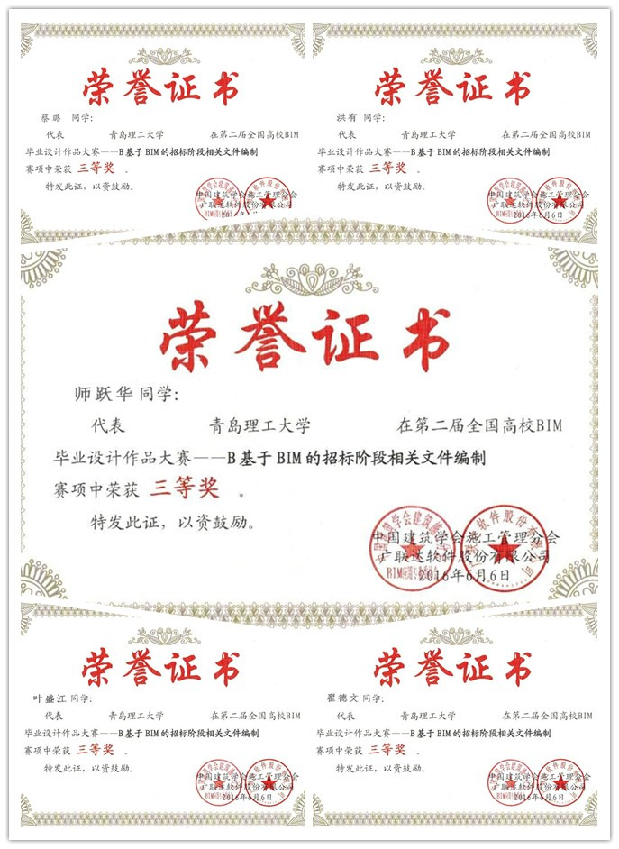 管理学院领导高度重视,精心组织,依托工程管理、工程造价省级品牌、特色专业,从师资、资金、技术等方面提供全方位服务与支持。从20161月份全国大赛开赛以来,参赛同学和指导老师付出了巨大努力。在专业教师的精心指导、学生的热情参与、团队成员团结协作和精心准备下,我院工程管理专业“恒韧”团队(指导教师王志强、胡龙伟)在提交的作品和现场答辩环节获得了评委组的高度认可,荣获团队特等奖,并获得广联达BIM5D软件应用技能认证证书;国际工程项目管理专业“飞--队”(指导教师姜吉坤、曹卫群)、工程造价专业参赛队伍(指导教师李松青)分获C模块二等奖、B模块三等奖。