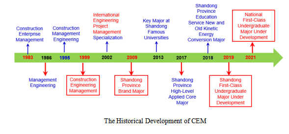 Qingdao University of Technology (QUT) is one of the earliest institutions dedicated to the cultivation of engineering management professionals. In 1983, the construction enterprise management specialty was established, and in 1986, the management engineering undergraduate major was established; in 1995, the management engineering major was renamed the construction management engineering major. In 1999, the construction management engineering was renamed the construction engineering management (CEM) according to relevant standards. In 2002, the international engineering project management undergraduate specialization was piloted. In 2009, CEM was approved as a Shandong Province Brand Major. In 2013, CEM was approved as a key major at Shandong famous universities; in 2017, CEM was approved as a Shandong Province High-Level Applied Core Major; in 2018, CEM was approved as a Shandong Province Education Service New and Old Kinetic Energy Conversion Major; in 2019, CEM was approved as a Shandong First-Class Undergraduate Major under development; in 2021, CEM was approved as a National First-Class Undergraduate Major under development.