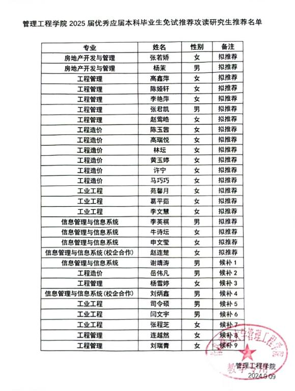 管理工程学院2025年硕士研究生推免报名资格审核通过名单公示