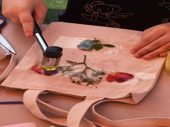 为提升学生心理健康意识,学院在“525心理嘉年华”特设“悦动青春,心向暖阳”创意区。活动前同学们精心收集樱花、海棠、连翘等植物,以明矾水浸泡处理,既保留自然原色,又能确保拓印效果参与同学们亲手挑选叶片与花瓣,在白色帆布袋上精心构图,用槌子反复敲击浸润过的植物,汁液与纹路逐渐渗透布料,晕染出深浅交织的春日图景,在老师的指导下,将春日花卉、叶片拓印于纯白帆布包,以传统技艺融合现代创意,传递绿色生活理念,展现文明新风尚。