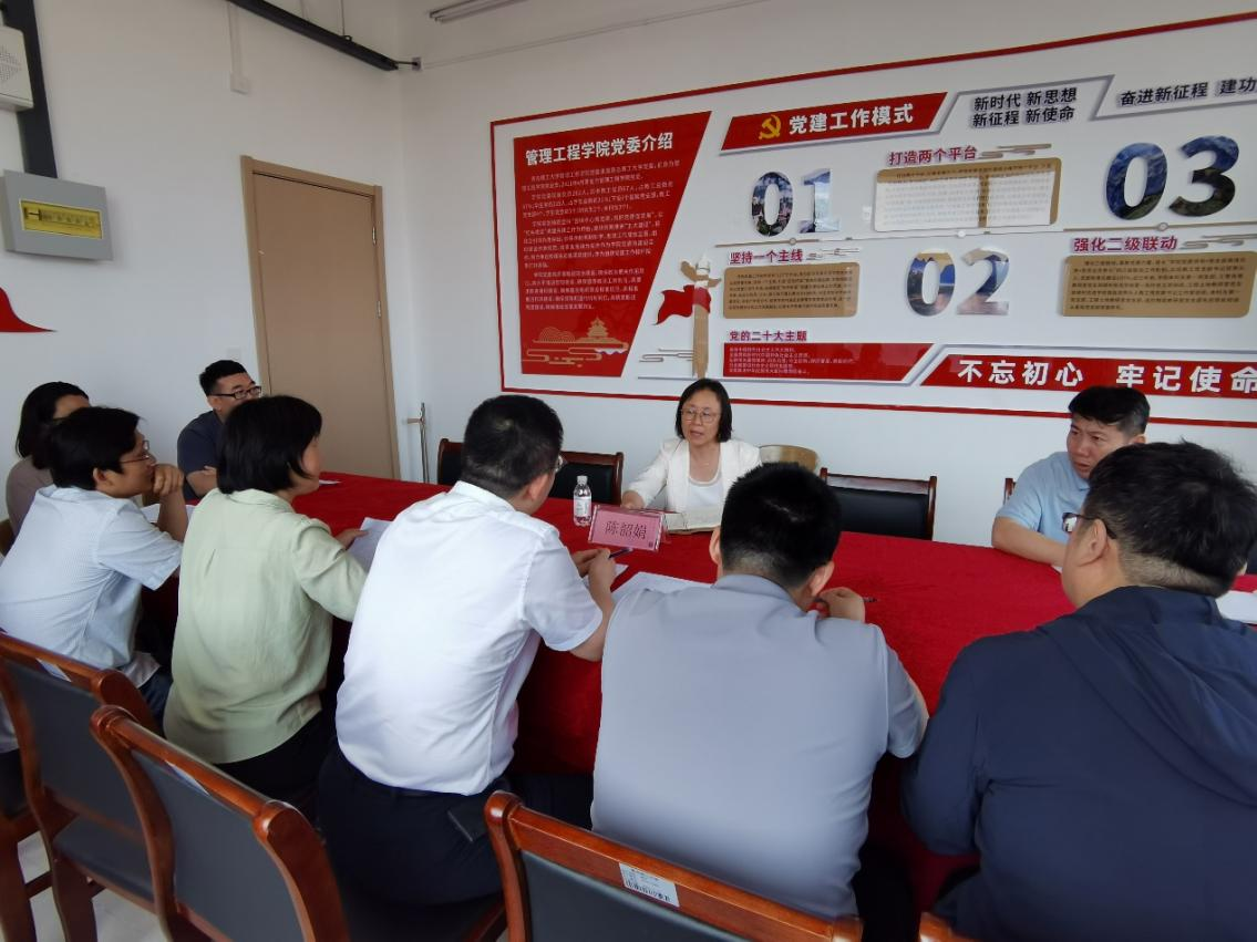 陈韶娟认真听取了支部教师关于科研团队建设、产教融合等瓶颈问题汇报,并现场进行指导。她强调,党支部要以 “学” 筑基,将党纪学习纳入教师发展必修课,定期组织专题学习、案例研讨,引导教师党员严守纪律红线,筑牢思想防线,不断提升自身的政治素养和职业道德水平;以 “干” 促行,充分发挥党支部的战斗堡垒作用,推动党建与国家级一流专业建设同频共振,在课程建设、教学改革、实习实践等环节融入党建元素,实现党建工作与专业建设的深度融合。她鼓励全体党员,要以此次授牌为新起点,把党旗插在教书育人第一线,在课堂教学、科研攻关、学生指导等工作中,发挥党员先锋模范作用,为申报管理科学与工程博士点凝聚红色动能,助力学院在学科建设、人才培养等方面实现新的突破。