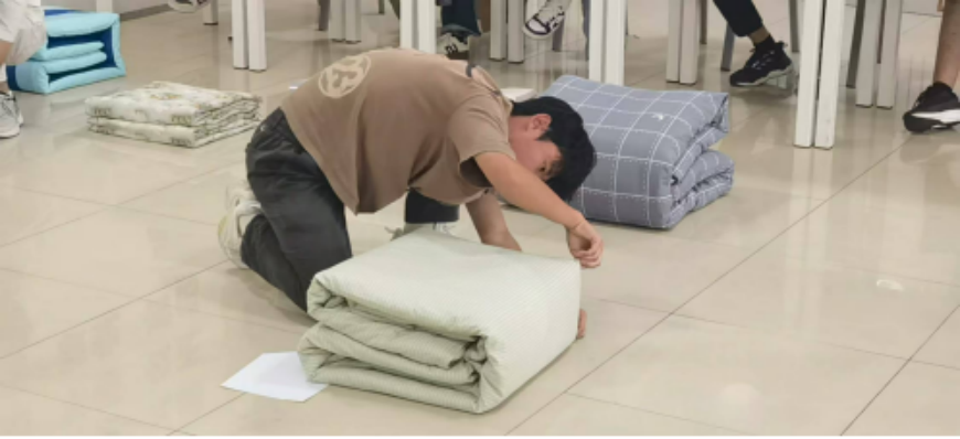 比赛现场,选手们沉着专注、动作娴熟,在一铺一压、一抠一捏之间,将柔软蓬松的棉被迅速塑造成棱角清晰、方正平整的“豆腐块”,充分展现了严谨规范、一丝不苟的军事素养,整场赛事组织有序、气氛热烈,体现出我院学子良好的精神风貌与踏实认真的劳动态度。